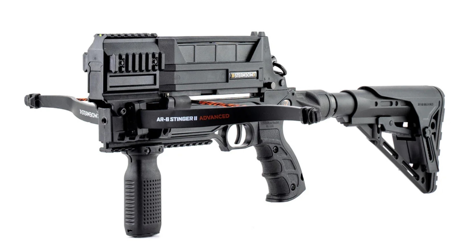 Features: 75 lbs limbsHolds a detachable 10-shot magazine with improved Iron SightsBuilt-in manual safety3 Picatinny Rails on removable front unit (one on top for Red-Dots or similar sights and 2 rails on either side) as well as a storage compartment within the front unitPicatinny rail under removable front unit optimized for Red-Dots to lower the line of sightFeatures our new side panels with string dampeners, an improved butt stock with a cheek rest as well as a more ergonomic foregrip with an internal storage compartment as well as the tuning triggerAR-style takedown pin to flip open the upper for quick limb-removal or string maintenanceCompatible with all AR-Series 6.2x162mm arrows and limbs