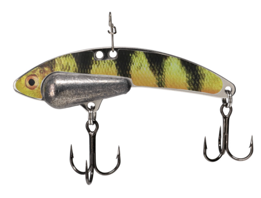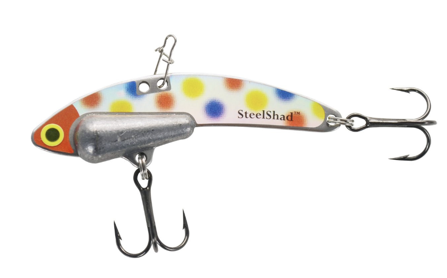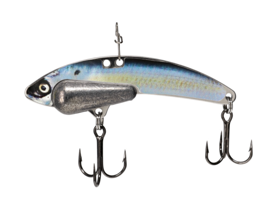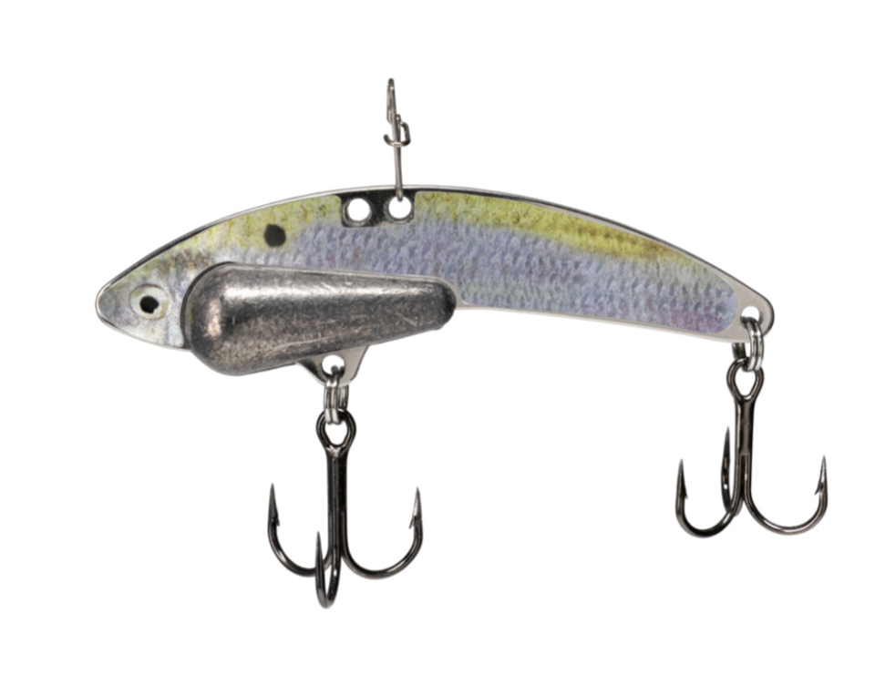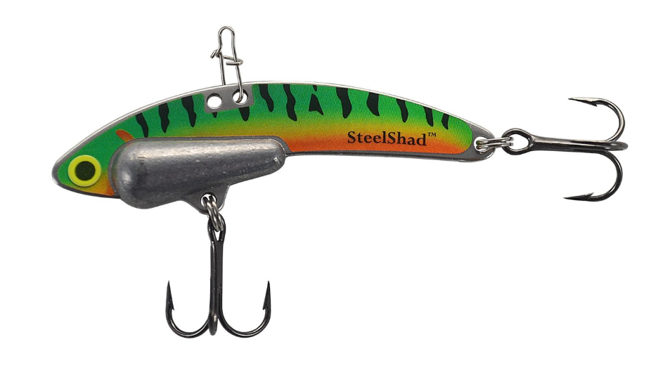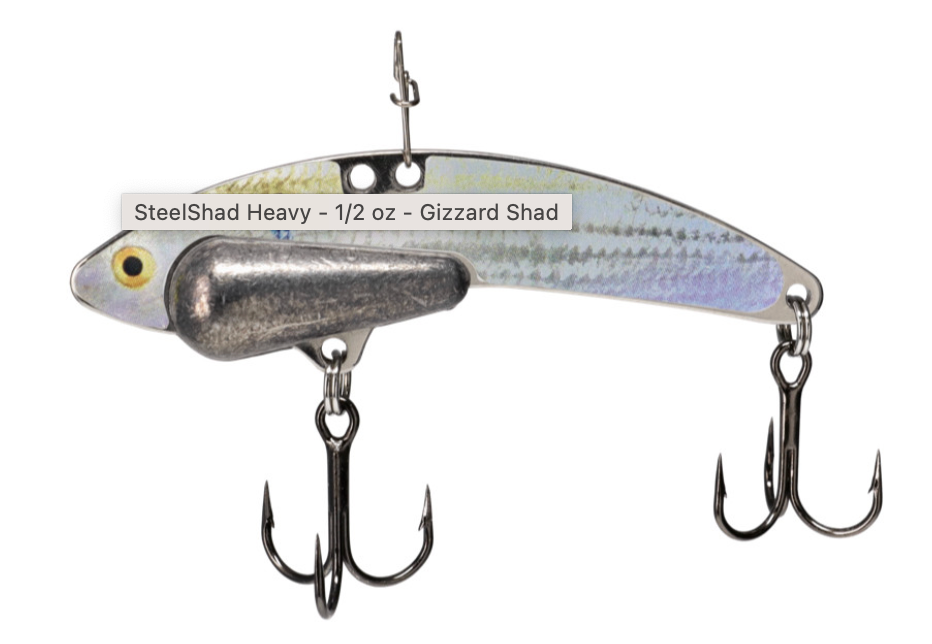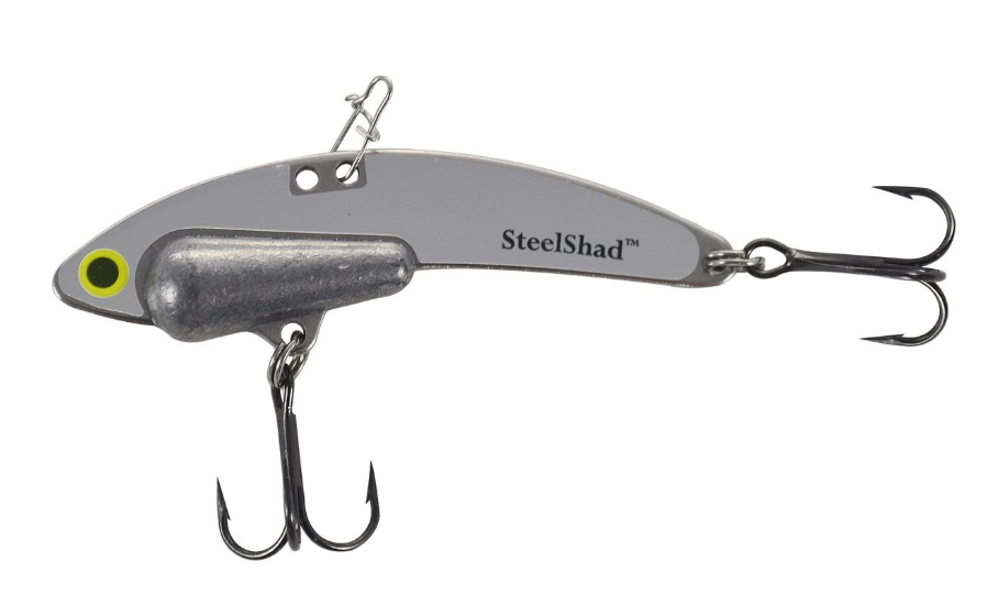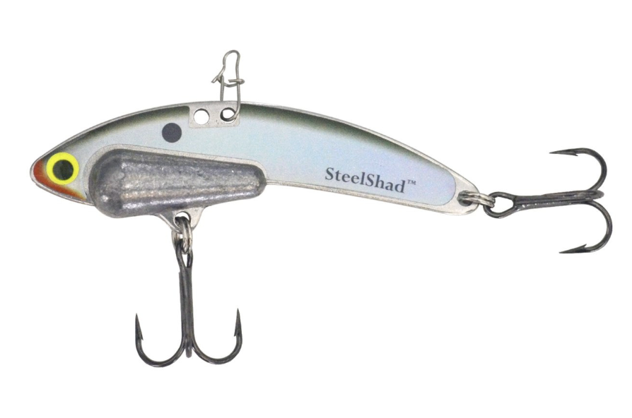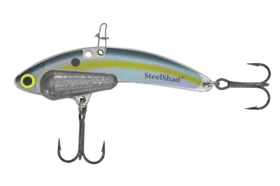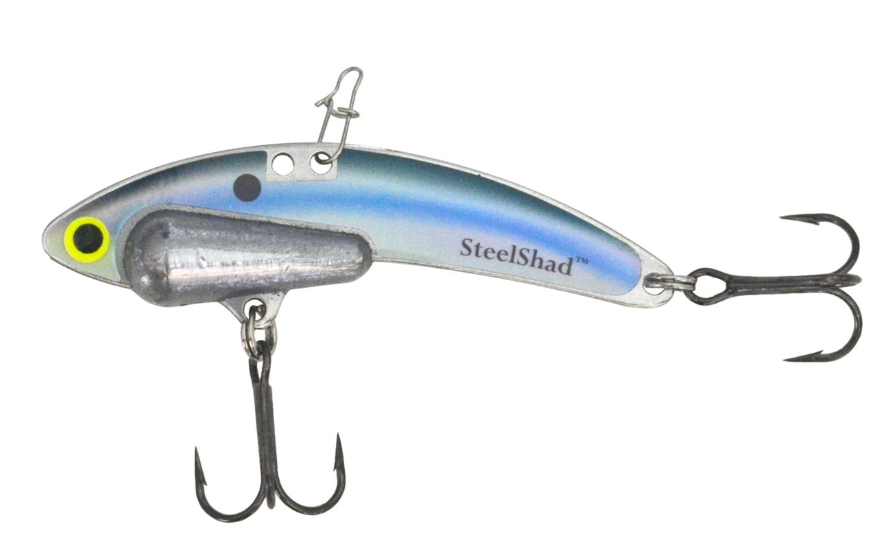 The SteelShad® Heavy Series 1/2 oz. blade bait is 2 1/4 inches long, made from durable stainless steel with a molded lead weight, and features two #8 VMC Black Nickel hooks and line clip.