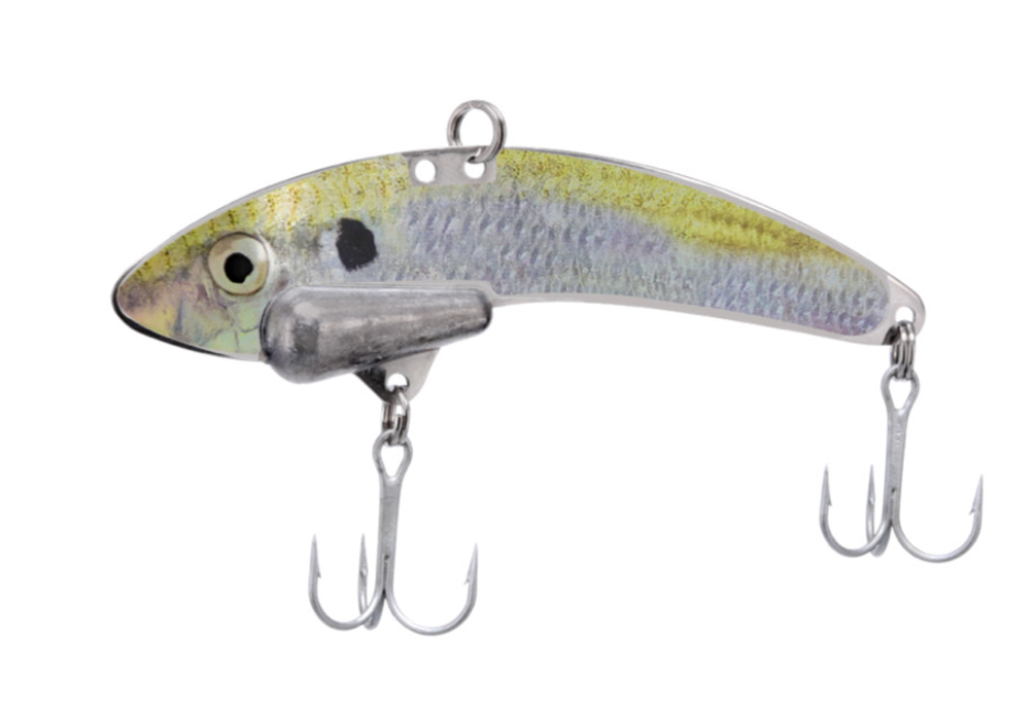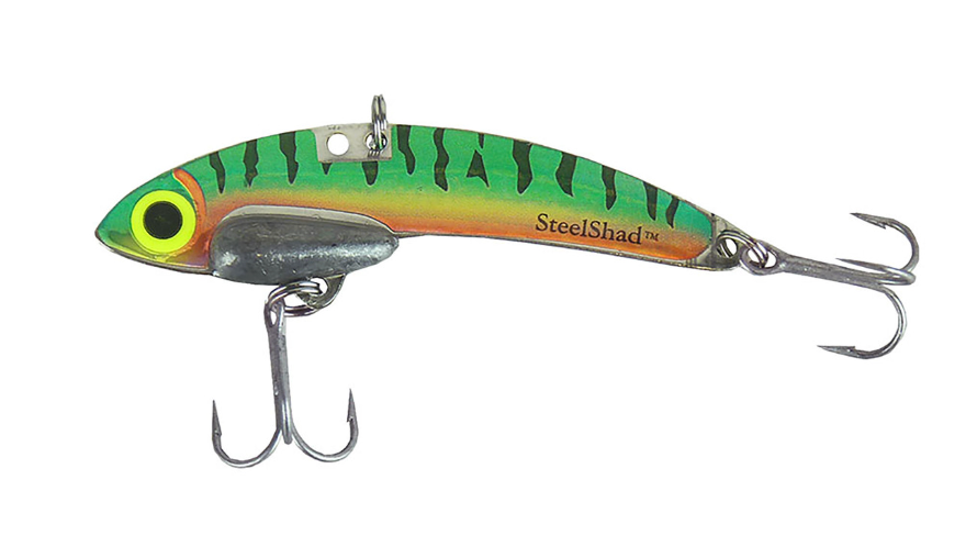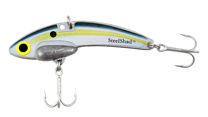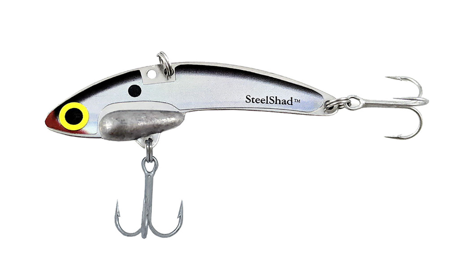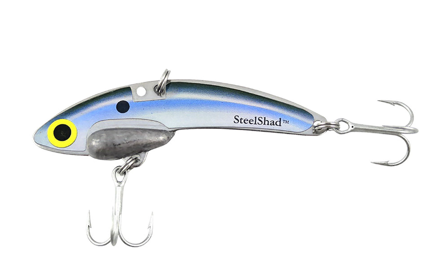 The SteelShad® XL 3/4 oz. blade bait is 3 3/4 inches long, made from durable stainless steel with a molded lead weight, and features two #4 VMC Permasteel hooks that are coated for both fresh and salt water fishing.