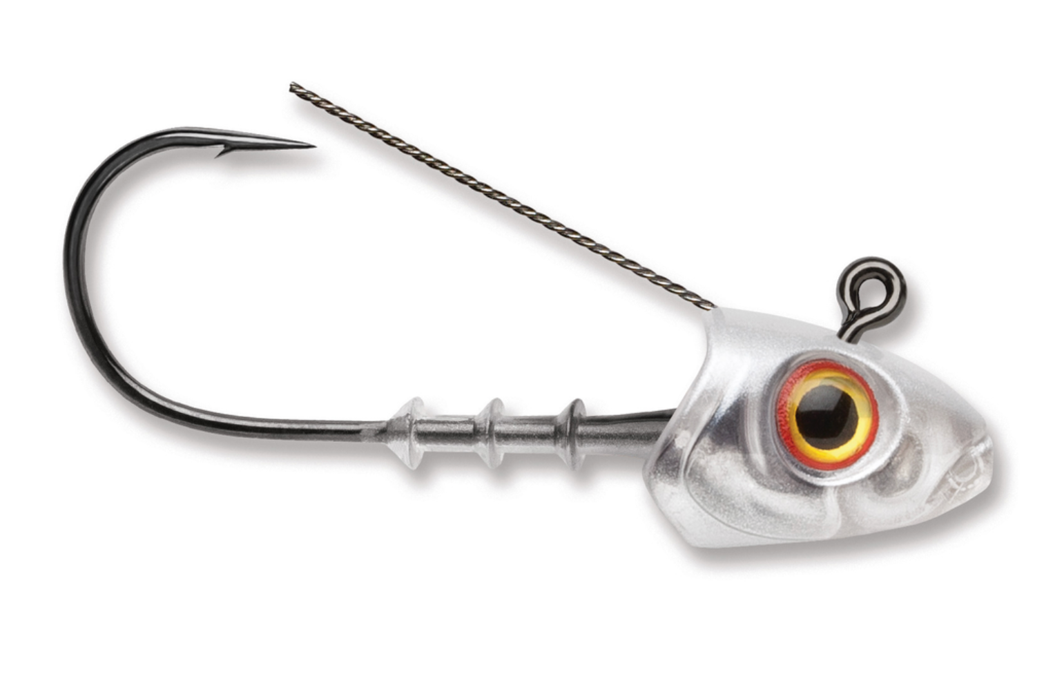 The new 360GT Searchbait® Weedless Jig Head has a thin wire guard that allows you to fish in and around weeds with ease. Exclusive VMC® Coastal Black® hook with extended “leg” on line tie further enhances action. 60° angle keeps the jig head swimming in the perfect position. Life-like rattling jig head and 360GT bodies fit precisely, with color patterns that perfectly match regional forage.