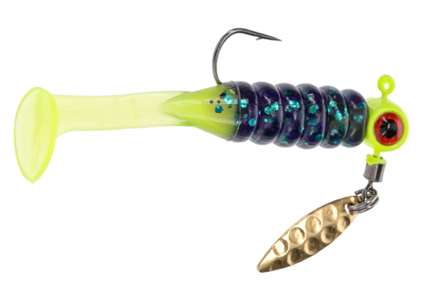Strike King Mr. Crappie Pre-Rigged Slabalicious Sausage Spin features a silver 3/4-inch hammered willow leaf blade and the innovative Sausage Head jig head pre-rigged with a Slabalicious. The blade spins when retrieved or jigged vertically, adding subtle glimmer, vibration, and sound. The disturbance attracts tasty slabs in all conditions and causes reactionary strikes when retrieved. The Slabalicious Soft Baits are active two-inch long baitfish profile bodies with a water-disturbing paddle tail action. Slow troll or jig, the Slabalicious crappie soft plastic lure is perfectly tuned to present a visual appeal and vibration aimed at bringing big slabs to your box! Strike King developed the brightly colored crappie fishing lures with "Mr. Crappie" Wally Marshall specifically to target crappie and other panfish. They can also entice diverse species, which adds to the fun. The Strike King Mr. Crappie Pre-Rigged Slabalicious Sausage Spin could very well be the best crappie lures money can buy.