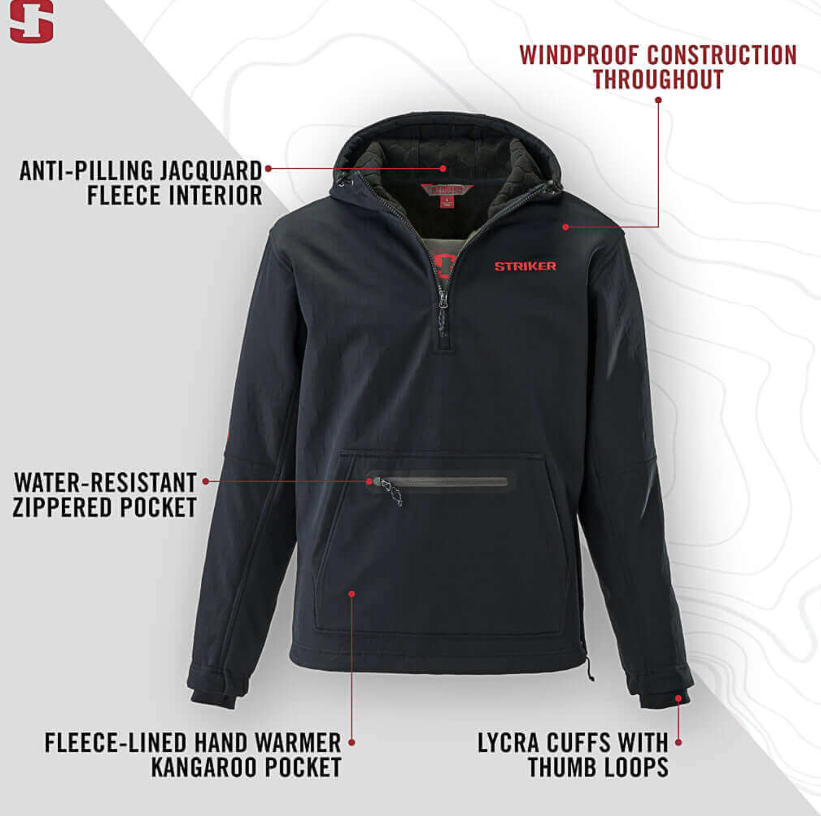 Torture tested in the North, the Striker® Renegade Pullover is as versatile as they come. From active days spent ice fishing to windy and cold days in the boat, there truly is no season the Renegade will not handle. Constructed of a durable windproof, breathable, and extremely water-resistant 3-layer softshell, it is as tough as 6AM ice. A fleece lined handwarmer pocket and front zippered stash pocket keep your hands warm and your essentials close. Zippered side vents help regulate temperature and adjustable hood and hem lock out the chill so you can enjoy the thrill.