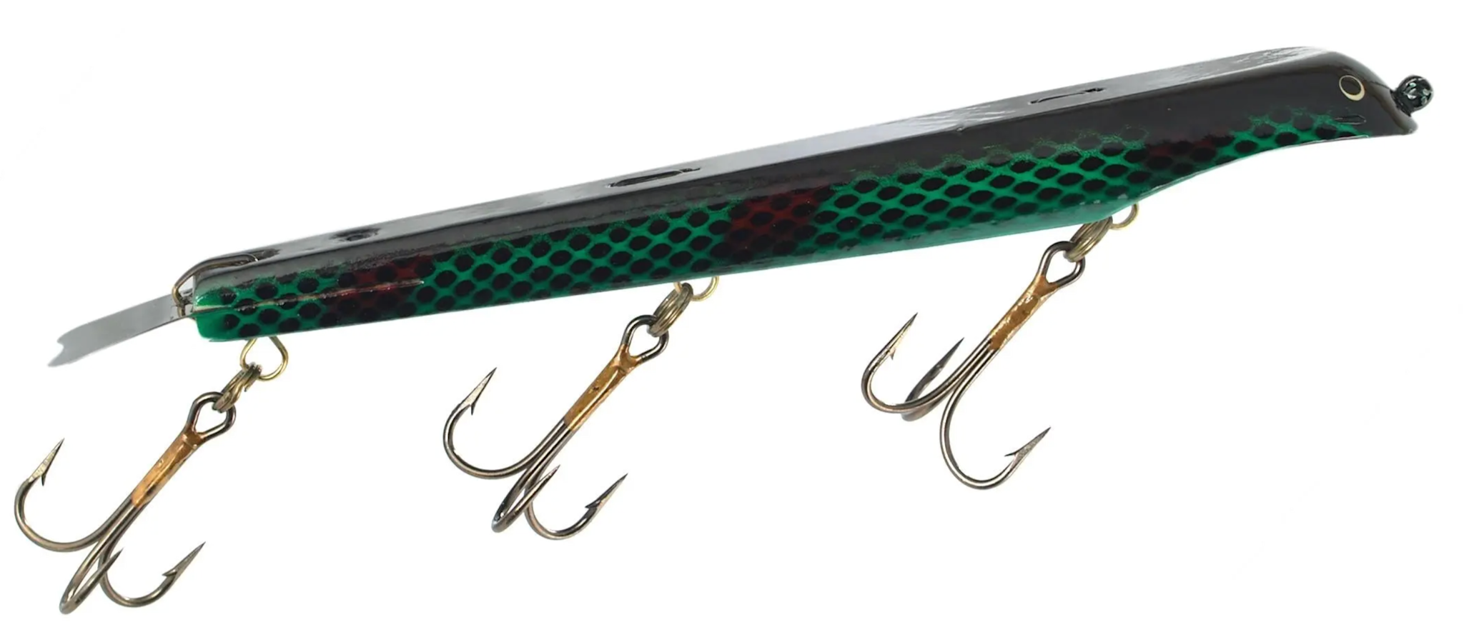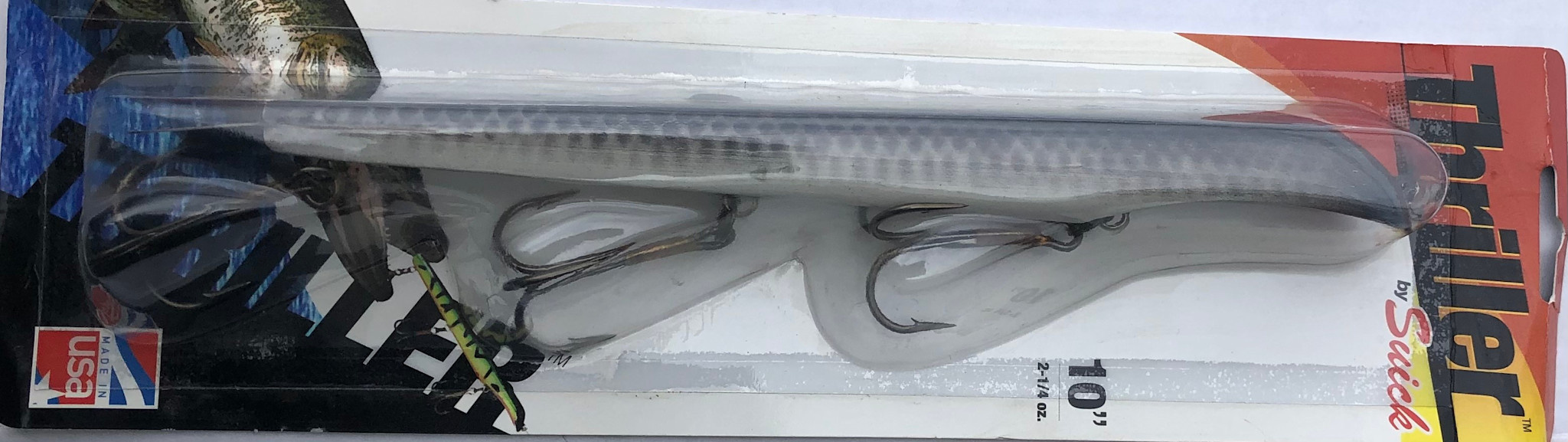 Suick 10″ Super Sized Non-Weighted ThrillerNumber of Hooks & Replacement Size (3) 5/0 TrebleLength: 10″Weight: 2 1/4 ozConstruction: Wood