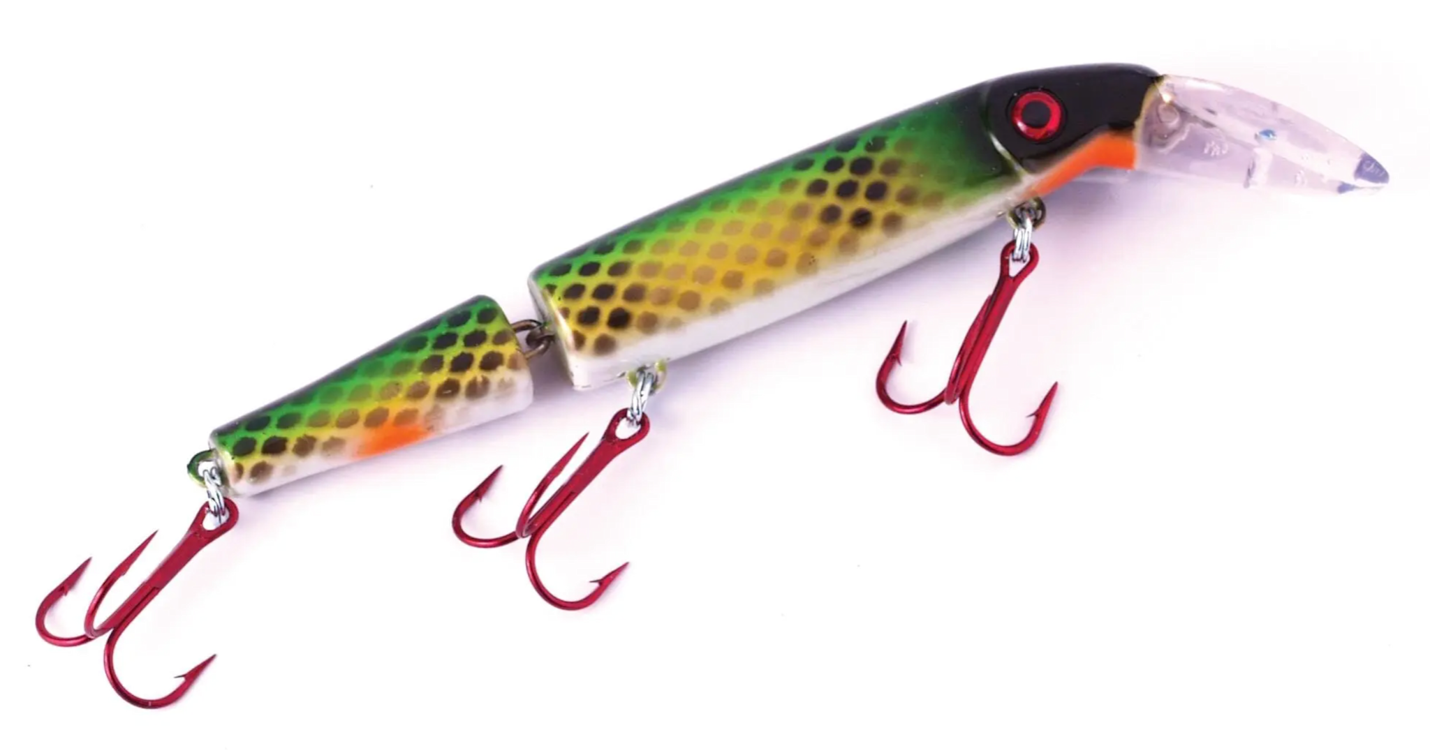 The Wrangler is a jointed version of the original Cisco Kid. Tooth-proof plastic with a molded in diving lip produces a nice tight swimming wiggle. Excellent mid-depth crankbait casting or trolled, very effective for fishing muskie, northern pike, large walleye and saltwater fish. The Wrangler is available in 12 fish catching color patterns.