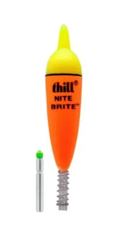 Unlike many lighted, night time floats with tangle-prone appendages, the Thill Nite Brite is a true center-slider float that glows brighter, lasts longer and makes fishing in the dark easy and productive. As a true slip-float, however, the Nite Brite also functions as a great float for daytime use, too. Simply unscrew the cap, push on the battery top and replace the cap. The E.L. battery/light gives off a super-bright glow that's easy to see even in waves.Species: Walleye, Crappie