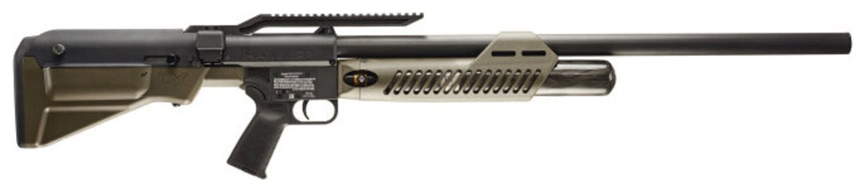 BLACK / OD GREEN FINISH, OD GREEN FINISHED POLY-ONE POLYMER STOCK, RECOIL PAD, MAGPUL AR15 STYLE PISTOL GRIP, VENTED FORE END WITH M-LOK SLOTS, 1-PIECE PICATINNY TOP RAIL FOR OPTICS, 4500 PSI (24 CU IN.) PRESSURE TANK, PRESSURE GAUGE, FOSTER QUICK DETACH FITTING, REAR SLING STUD, 700 FT LBS SLUG ENERGY WITH 550 GRAIN SLUG, WILL FIRE 3-ROUNDS BETWEEN PRESSURE TANK FILL UP