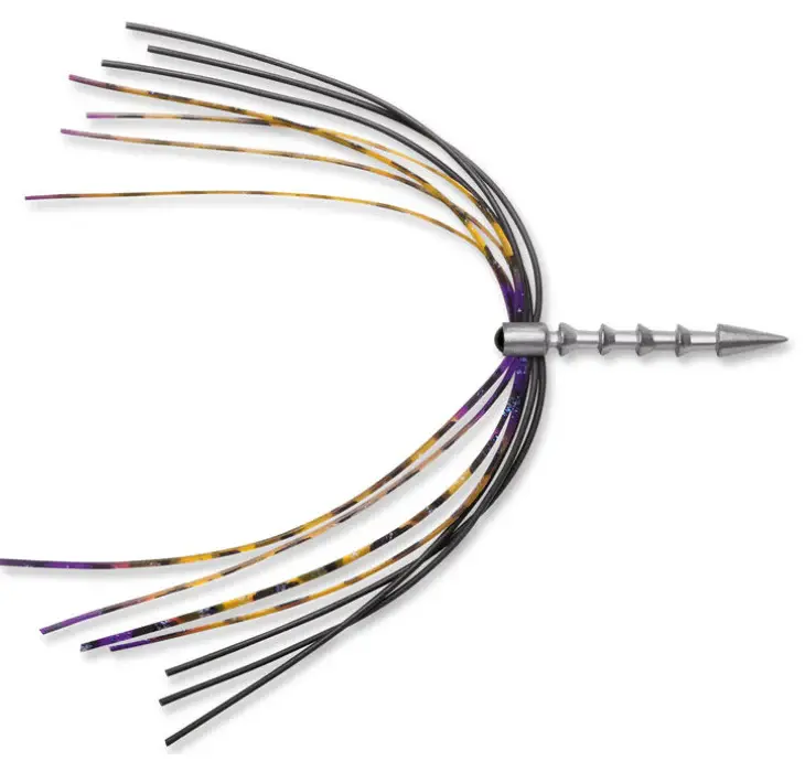 Two-part skirt combining living rubber and silicone material creating a unique action underwater at all temperatures.