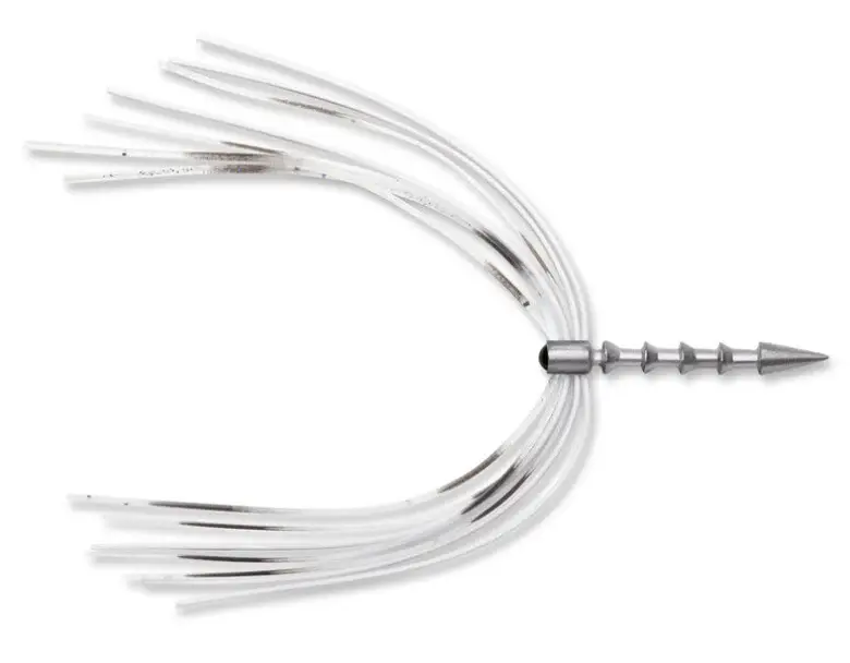 Two-part skirt combining living rubber and silicone material creating a unique action underwater at all temperatures.