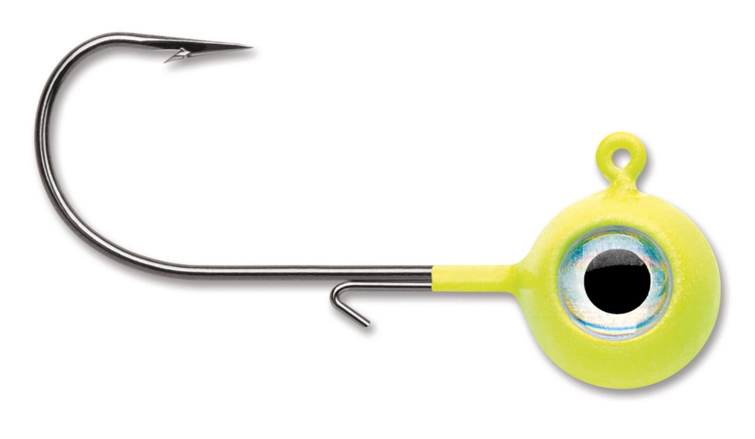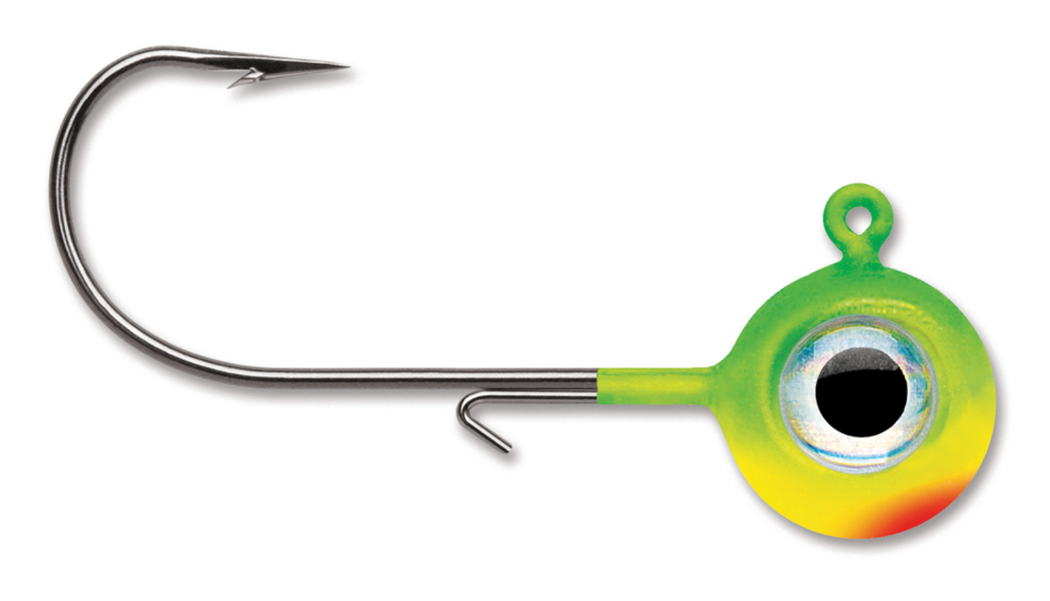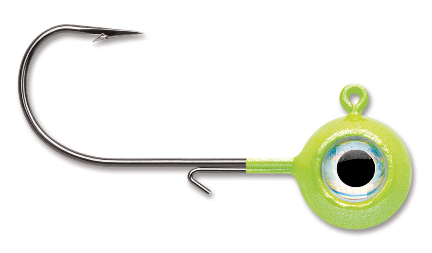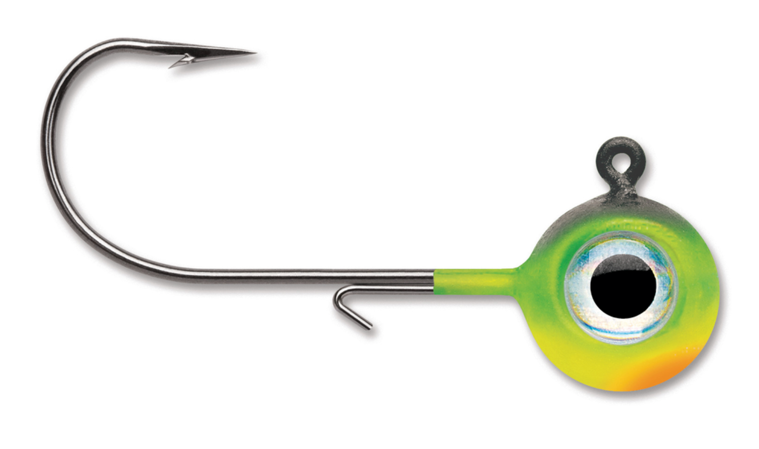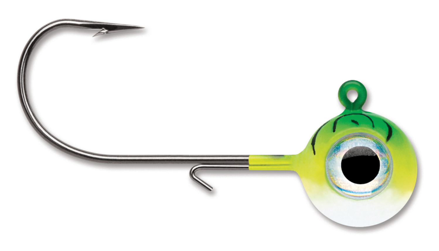 This VMC® upgraded version of the traditional Aspirin-shaped heads provides added control. 3-D holographic eyes create the illusion of a wider profile while adding realism. Assembled with a VMC® Premium high-carbon steel hook with top of the line black nickel finish. The wide range of colors includes UV Bright finish colors that guarantee you to catch more fish in all water conditions.