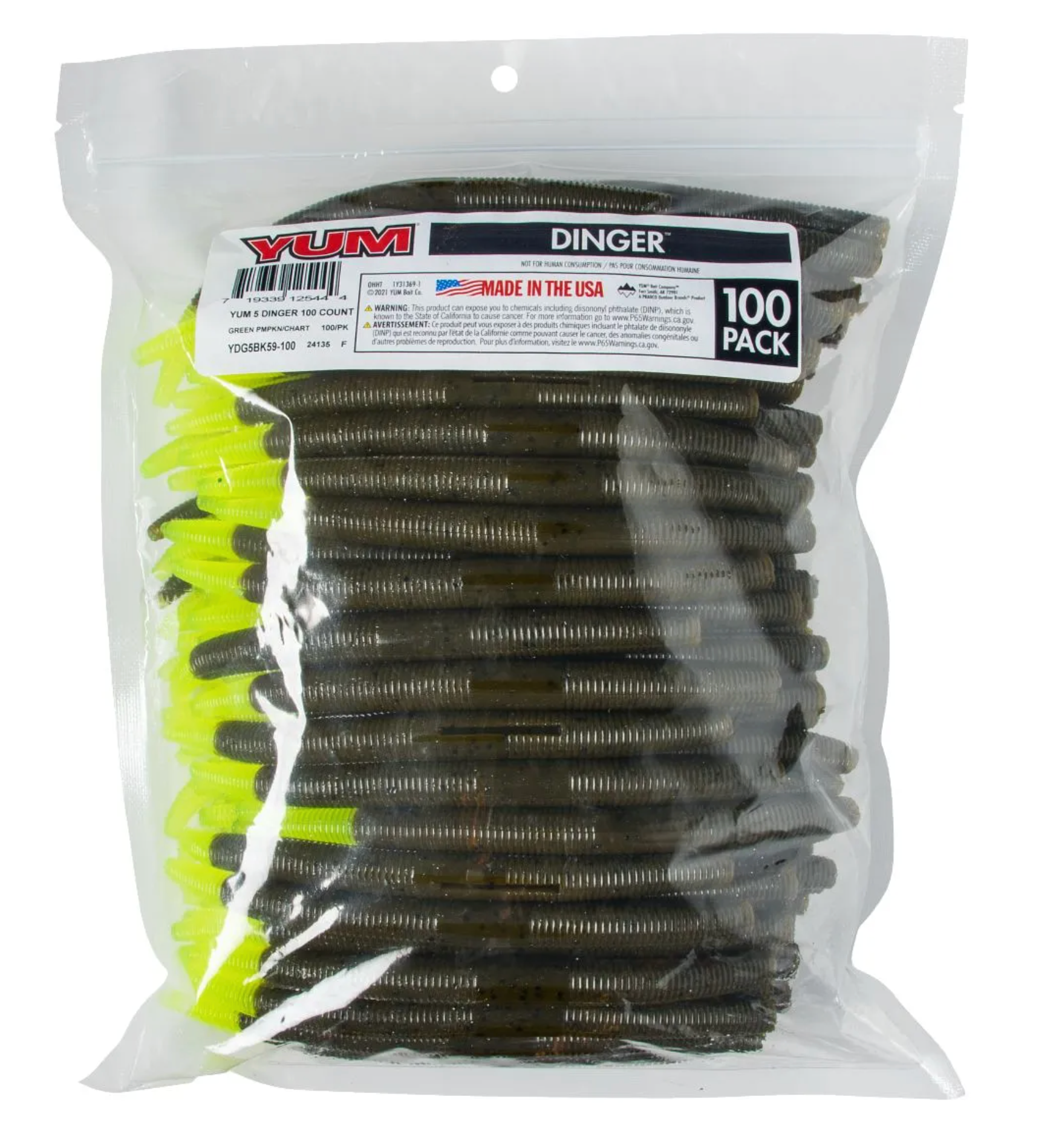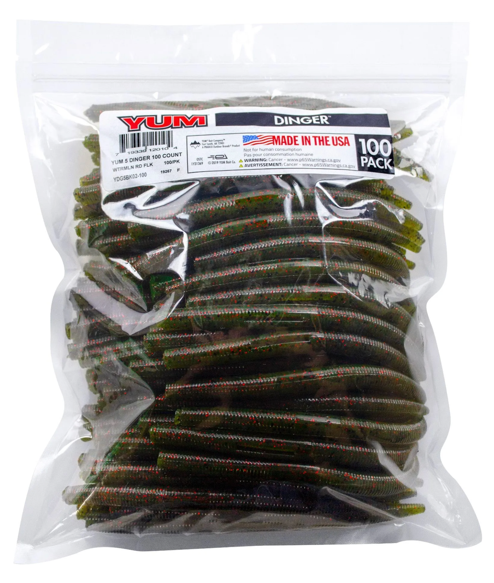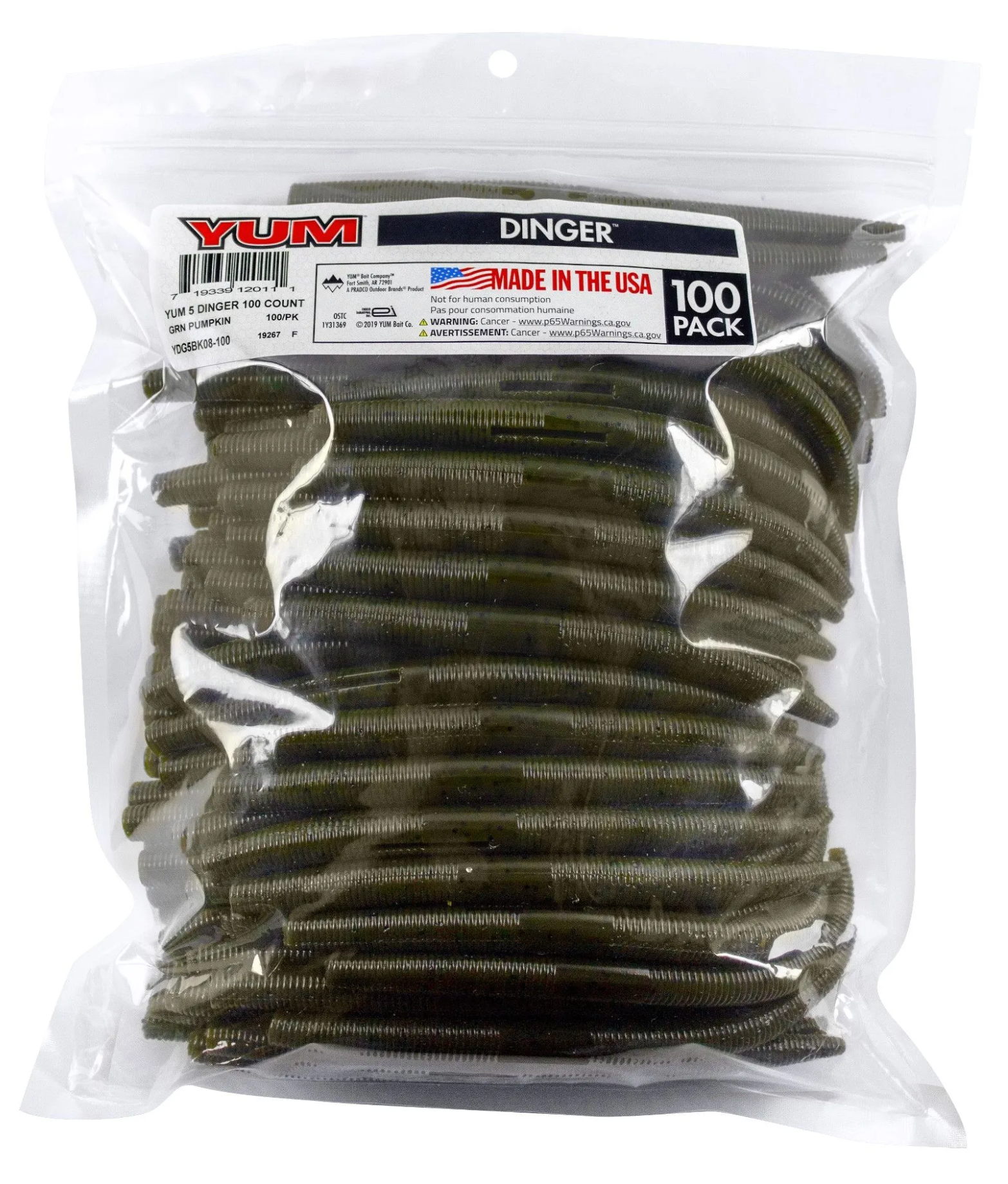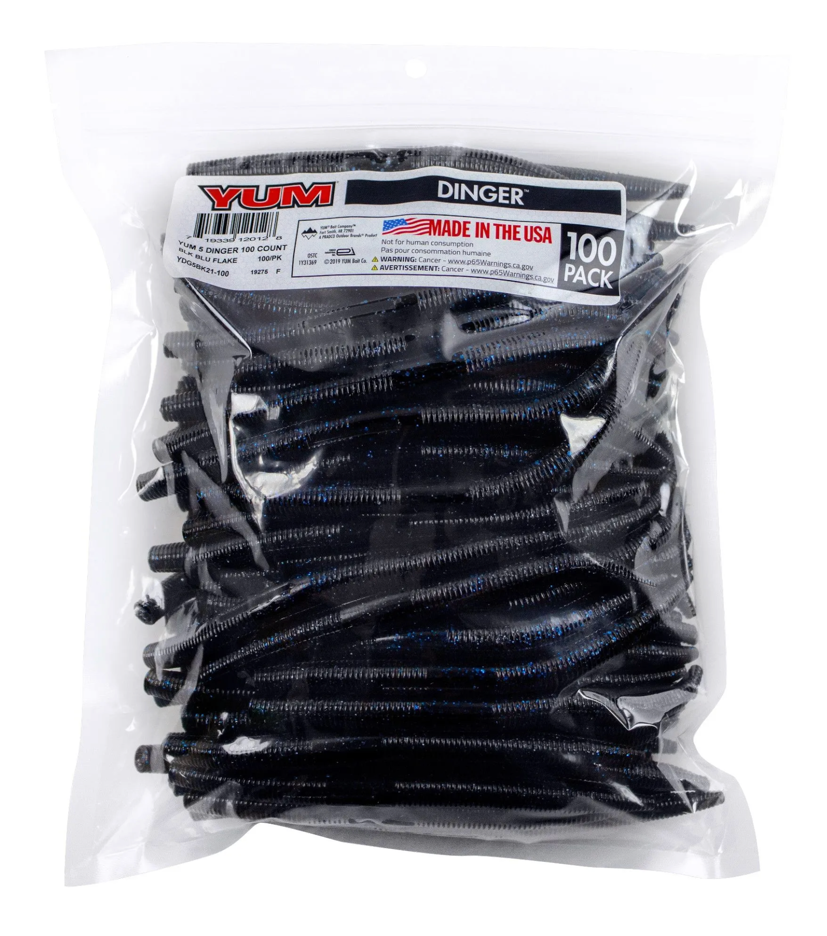 YUM 5 Inch Bulk Dinger 100 Pack One of the most versatile soft plastics on the market, the YUM Dinger can be Texas, Carolina and wacky rigged, weighted or weightless, and catches bass when other lures fail. This soft plastic bait presents a very subtle life-like action that even highly pressured fish can't resist. YUM Dingers have a unique hook slot that provides better hook-ups, and they're tougher than similar baits -so you get more fish per bait than any other.